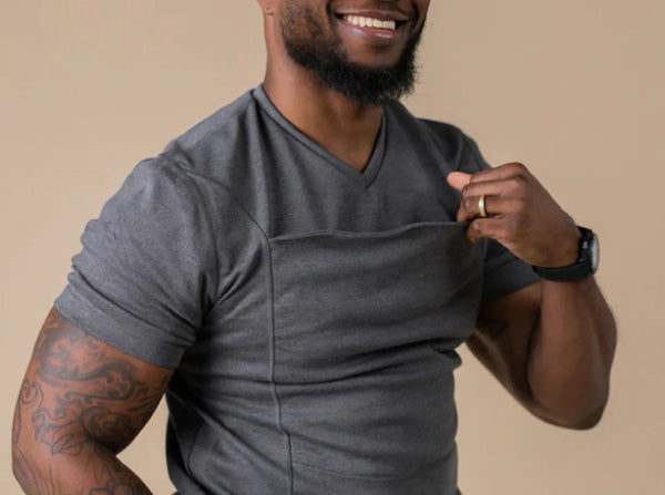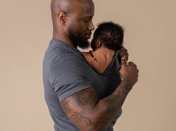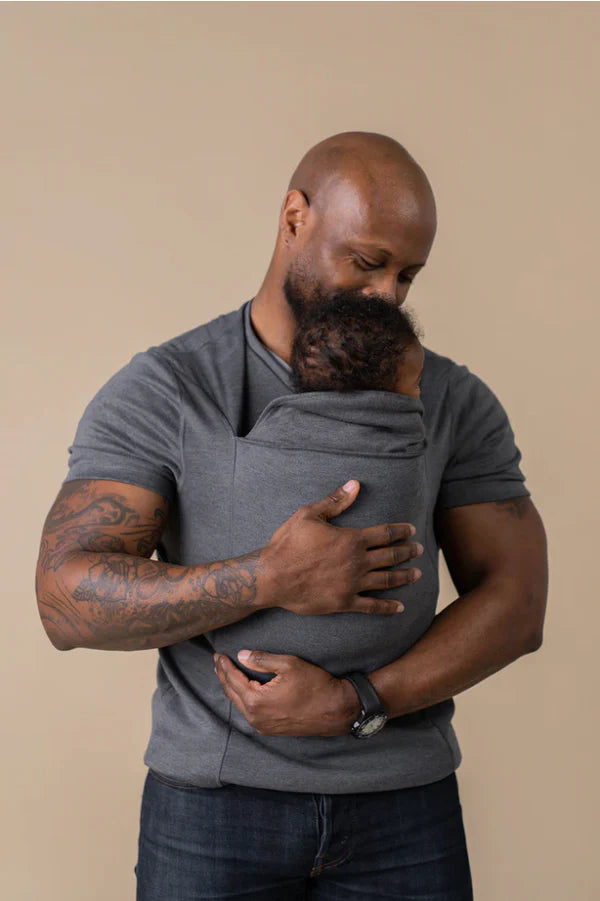 The Dad Shirt is designed to fit like your favorite athletic shirt—form-fitting for proper support and safe babywearing. The built-in mesh-lined pouch holds your newborn securely, while the extender helps taller babies stay snug (but doesn’t replace head support).