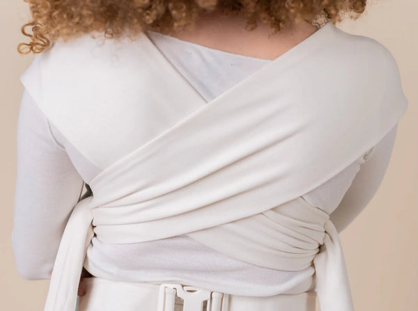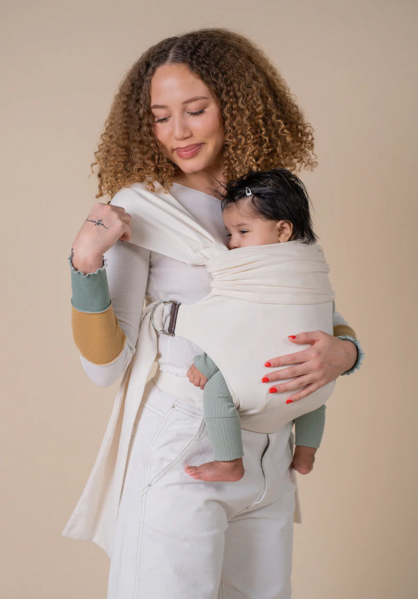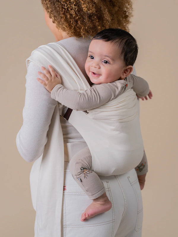 The Simple Wrap is soft like a traditional wrap but structured like a carrier—no complicated tying, just simple, secure babywearing for babies 13–28 lbs.